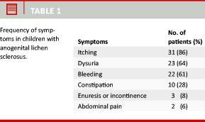 Results: A total of 35 girls and one boy were diagnosed with anogenital LS. The diagnostic delay was 17 months. Pruritus, dysuria, bleeding and constipation were the dominant complaints, while one patient was asymptomatic. Referral was made by general practitioners, private dermatologists and paediatricians. Sexual abuse was suspected in five cases. Ten patients underwent biopsy confirming LS. Before a definite diagnosis was given, many children were extensively treated with various topical and oral agents. In our outpatient clinic, 30 children were treated with potent/ultra-potent corticosteroids and five patients were treated with calcineurin inhibitors.