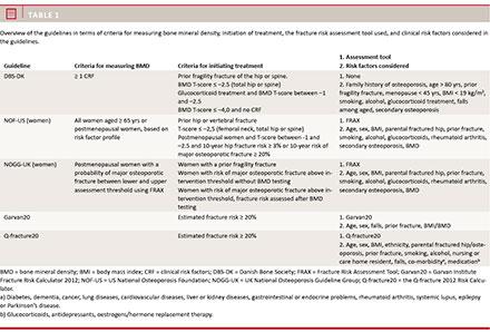 In recent years, several evidence-based guidelines have been launched for assignment of anti-osteoporotic medication that implement fracture risk calculation [8-10]. There is great diversity in how the assessment tools are incorporated and how the intervention threshold is defined.