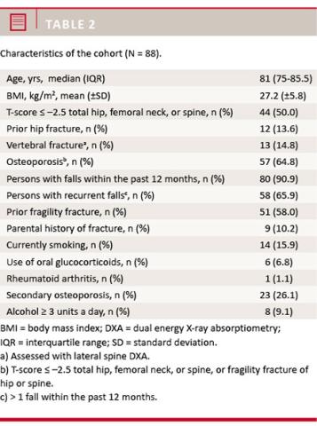 Methods: We studied 88 women attending a falls clinic. Dual energy X-ray absorptiometry and vertebral fracture