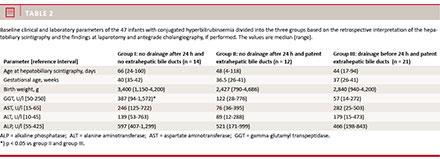 Table 2 illustrates the demographic characteristics of the 47 patients (20 females and 27 males) included in groups I-III. Overall, the median age was 48 (4-160) days. BA patients (group I) had significantly higher levels of GGTP (compared with group II; p = 0.019 and group III; p = 0.0001). There was no significant difference in GGTP blood levels between patients in groups II and III (p = 0.734 and p = 0.115, respectively). No significant statistical difference was evident in gestational age, age at HS, birth weight or blood levels of AST, ALT and ALP (Table 2).