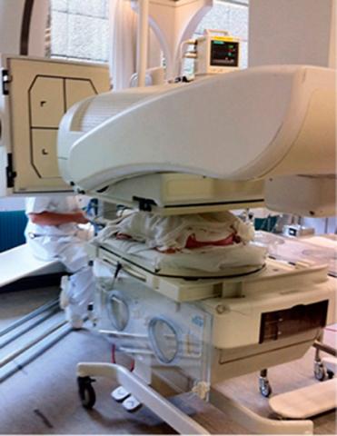 Even neonates who need continuous monitoring of vital parameters lying in an incubator can be scanned by the two-headed gamma camera.