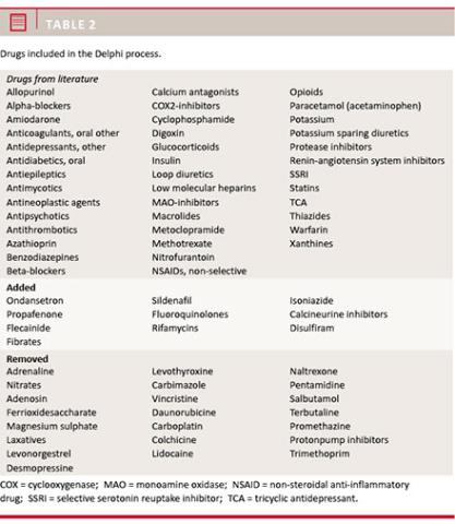 In the first round of the Delphi process, consensus was reached for anticoagulants, loop diuretics and beta-blockers. For 13 other drugs or drug classes, consensus for either potential of harm or interaction was reached.