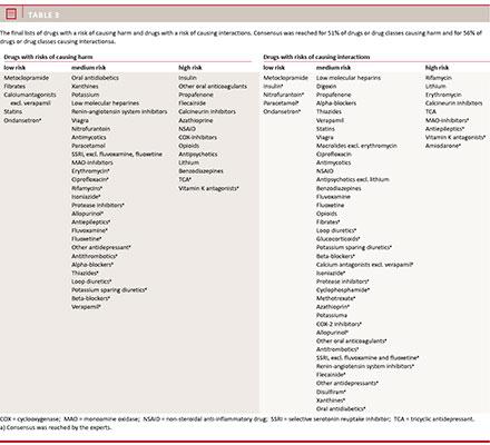 For drugs causing adverse interactions, the experts agreed on only one drug class from the previous literature review, namely vitamin K antagonists (e.g. warfarin) [5]. In fact, only nine drugs were present in the high-risk group of interactions. We compared the drugs in the low-risk, medium-risk and high-risk groups, respectively, with the recommendations in the Danish public Database of Interactions [13] and found that high-risk drugs are in concordance with the drugs that have red warnings (critical interactions), medium-risk drugs are in accordance with the yellow warnings (potentially problematic interactions) and low-risk drugs are in accordance with green warnings (unproblematic interactions). This could either be because the Delphi panel consulted this database prior to scoring each drug, or it could be so because the interactions mentioned in the database were based on clinically available data and, thus, considered clinically relevant by the experts.