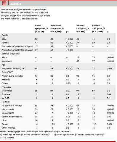 The overall results are listed in Table 1. The results of the comparative analyses are shown in Table 2. The study population comprised 2,000 consecutive patients. Their mean age was 52 years, 65% of the study population was 45 years or older. 58% were women. 19% had alarm symptoms leading to OGD. 73% received pre-endoscopic treatment (PET) (91% of these received proton pump inhibitors (PPI)) when presenting for endoscopy. 97% of the OGDs were performed trans-nasally, 2% trans-orally and 1% was unsuccessful. There were no complications in the 2,000 cases.