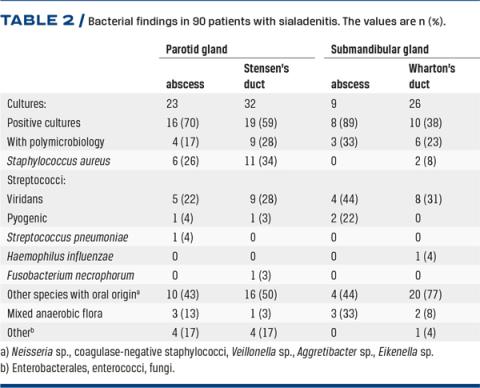 Samples were collected in 90 (57%) cases. More than one pathogen was found in 24% of the cultures. The most common pathogens were viridans streptococci(25 isolates) and S. aureus (19 isolates) (Table 2). S. aureus was almost exclusively found in PG (17/19 cases), whereas isolates with viridans streptococciwere more equally distributed between the glands (PG: 14 isolates and SMG: 11 isolates).