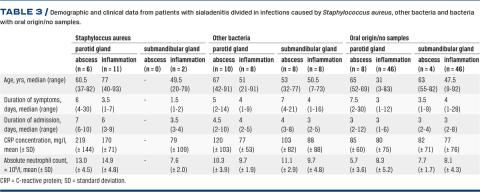 Results: In total, 157 patients with ASI were included. The parotid gland (PG) was affected in 89 (57%) cases and the submandibular gland (SMG) in 68 (43%) cases. The most prevalent bacterial findings were viridans streptococci (25 isolates) and Staphylococcus aureus (19 isolates). S. aureus was almost exclusively found in PG (17/19 cases). S. aureus-positive cases showed a significantly higher inflammatory response than other bacteria (C-reactive protein, p = 0.008 and absolute neutrophil count, p = 0.0108).