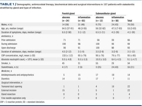 In total, 157 (78 males) consecutive cases of ASI were eligible for the study (Figure 1). Thus, the mean annual incidence was 1.4/100,000/year whereof 14/157 were children (under the age of 18 years). PG was affected in 89 (57%) cases and SMG in 68 (43%) cases. The median age was 53 years (range: 3-93 years), the median duration of symptoms was four days (range: 1-30 days), and the median duration of admission was three days (range: 1-12 days). The duration of admission was significantly longer in PG cases than in SMG cases (p = 0.039, Kruskal-Wallis test). No statistically significant difference was found between the two glands concerning C-reactive protein (p = 0.09, Kruskal-Wallis test) or absolute neutrophil count (p = 0.28, Student’s t-test) (Table 1). None of the patients had undergone surgery prior to admission. Thirteen patients (8%) had active acute medical diseases such as pneumonia or erysipelas at the time of admission.