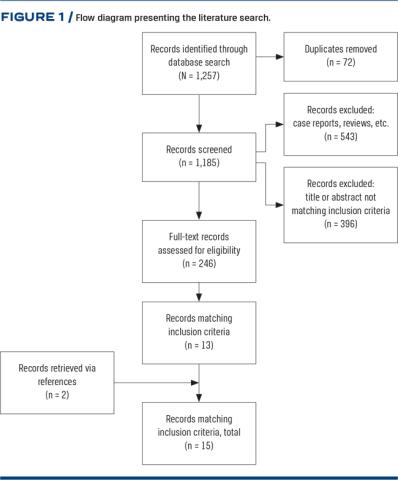 The literature search produced 1,257 publications (Figure 1). The excluded publications included 72 duplicates; 543 case reports, reviews or guidelines; and 396 publications where the title or abstract did not include data regarding analysis of the incidental 18F-FDG-PET/CT findings in cancer patients. Full-text analysis of the remaining 246 studies left 13 studies matching our inclusion criteria. Another two studies were retrieved via references (Figure 1). In the 15 studies analysed, 15,101 cancer patients (age range: 16-93 years) had 1,639 incidental foci. A total of 549 foci were not investigated due to advanced diseases or for unknown reason or were lost to follow-up; 1,090 PClR foci in 1,068 patients were investigated, revealing 270 (25%) malignancies, 166 premalignant lesions (15%) and 206 (19%) benign lesions needing treatment (PPV 59%) (Table 1), whereas 448 foci were FP (Figure 2). The 549 foci that were not investigated imply a risk of bias. If they were all TP, the PPV would be 0.73, and if FP the PPV would be 0.39. Similar calculations in our data produced a PPV of 0.83 if the foci that were not evaluated had all been TP and 0.28 if they had been FP.