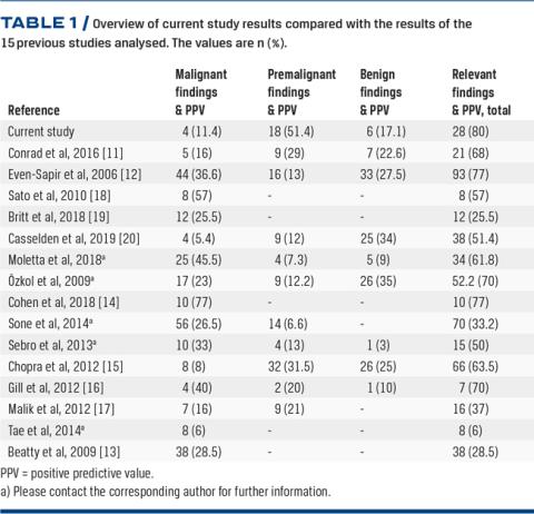 Our frequency of FP findings was significantly lower than frequencies reported in the previous studies (χ2 = 6.3; p < 0.05) (Figure 2). There was no significant difference if TP malignant and premalignant lesions were grouped together or regarding benign lesions, but the frequency of TP malignant foci in our study was significantly lower than in the previous studies (Fisher’s exact test, p < 0.01).