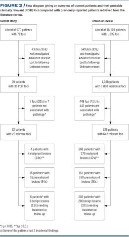 RESULTS: A total of 28 foci (80%) were clinically relevant and elicited management or follow-up including four malignancies and 18 premalignant and six benign lesions. Seven foci were without pathology. The estimated additional cost was 1,984 US$ per focus. In the literature review, 642 of 1,090 foci (59%) were relevant, distributed as 270 malignancies, 166 premalignant and 206 benign lesions, whereas 448 foci were without pathology.