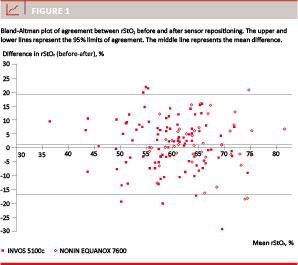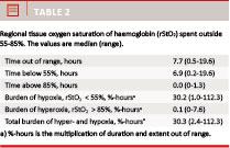 The median burden of hypo- and hyperoxia was 30.3%- hours (Table 2). The median burden of hyper- and hypoxia was 37.7%-hours (range 2.8-112.3%-hours) with INVOS and 8.5%-hours (range 2.4-18.4%-hours) with NONIN.