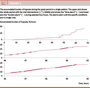 To intervene every time a highly fluctuating rStO2 goes below 55% may possibly lead to overtreatment. However, the “time-alarm” would be insufficient for the phase II trial only alerting during 49% of the total burden of hypoxia, whereas the “burden-alarm” would alert during 77% of the total hypoxic burden.