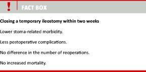 Temporary ileostomy is frequently constructed to relieve a rectal anastomosis and avoid peritonitis if the anastomosis is leaking. Ostomy is a burden for both the patient and society and early closure is therefore desirable to counteract increased morbidity. Several prospective studies and a single randomized controlled trial have shown that closure in less than two weeks was associated with lower or equal morbidity compared with later closure. Thus, current data support early closure of temporary ileostomy performed to cover rectal anastomosis in routine clinical practice.