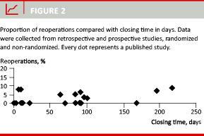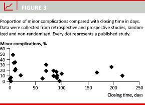 No prospective controlled trials have shown increased morbidity with early closure compared with later closure. In the studies which have used early closure, i.e. within two weeks, the rates of minor complications vary between 20% and 34% [22, 31]. Studies with a longer closing time report rates of minor complications varying from no complications [25] to 48% among patients with complications [22]. Most studies, however, report rates somewhere in-between [2, 30, 32]. Overall, the risk of developing minor complications is considered not to be higher in early closure than in late closure of the ileostomy (Figure 3).
