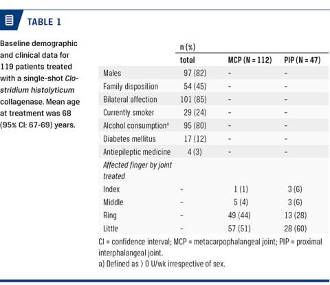 The aim of this study was to evaluate the effectiveness of a single-shot C. histolyticum collagenase treatment at a regional hospital in non-selected patients with a least one year of follow-up (FU). The following outcomes were evaluated: 1) overall improvements in degrees from baseline to FU in MCP and PIP joints;