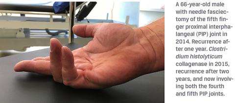 Skov ST, Bisgaard T, Søndergaard P et al. Injectable collagenase versus percutaneous needle fasciotomy for Dupuytren contracture in proximal interphalangeal joints: a randomized controlled trial. J Hand Surg Am 2017;42:321-8.