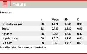 The effectiveness of the CAMS treatment is described in Table 2, Table 3 and Table 4. We observed a significant decrease in the five suicidal markers with a medium to large effect size between 0.47 and 0.99. This suggests an improvement in the patient’s subjective experience and elimination of the suicide risk.