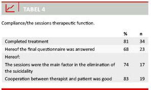 Results: A total of 81% of the patients completed treatment and 68% hereof completed the final evaluation. 74% from this group judged the sessions to be the main factor in the elimination of their suicidality. A significant decrease was observed in the five suicidal markers recorded for the 42 patients included. One patient attempted suicide and another patient committed suicide.