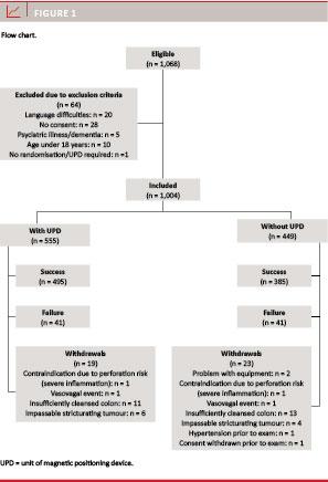 Material and methods: A total of 1,068 consecutive patients referred for colonoscopy were enrolled and randomised for investigation with or without use of UPD. The evaluation endpoints were: success rate (coecum visualised, ileal intubation was carried out at the investigator’s discretion), duration of procedure, and patient discomfort indicated by the patient as a visual analogue scale score.