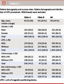 A total of 1,004 patients out of 1,068 were found eligible to enter the study according to the protocol (Figure 1). Distribution of patients between the clinics, patient demography, distribution of use versus non-use of UPD, and success rates for the clinics as well as for the individual endoscopists are shown in Table 1 and Table 2.