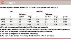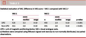 A total of 936 (93%) patients completed a VAS 1 form, 884 (88%) patients completed a VAS 2, and 432 (43%) patients completed a VAS 3 form. No significant differences allocated to the use of UPD were demonstrated. In both groups, VAS 2, however, was significantly lower than the corresponding VAS 1 (Table 3, Table 4 and Table 5).