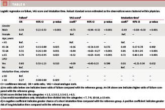 Furthermore, we performed multivariate regression analyses on three different outcome variables. An ordinary logistic regression analysis was carried out on the binary outcome measuring success or failure. As the assumptions of a linear regression model were not fulfilled for the two continuous outcome measures, VAS and intubation time, we grouped the observations according to the percentiles of their distribution and performed ordinal logistic regression analyses. Gender, age and UPD were included as explanatory variables in all regression analyses. As age was not a linear predictor in two of the three regression analyses, we included this variable as categorical in all three regressions defining age groups according to the age distribution. We estimated robust standard errors in order to account for clustering of patients.