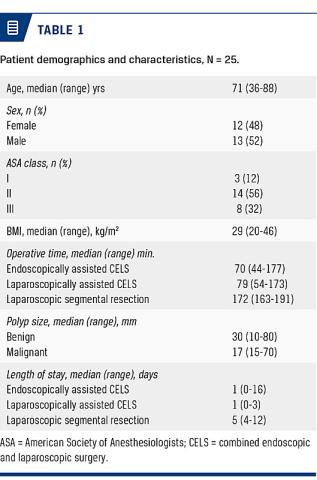 All patients scheduled for a CELS procedure from April 2016 to May 2017 were included in the study. The data were collected retrospectively from hospital records. Data included patient age, gender, American Society of Anesthesiologists class, BMI, Zubrod score, operative time, polyp characteristics, indication, length of stay and procedures.