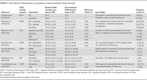 The literature regarding treatment of PTSD favours CBT-based approaches, among which PE has been documented to be effective [5]. However, differences in treatment duration, follow-up, trauma types and dropout rates in the included studies make it difficult to conclude anything across studies. We investigated the treatment effect and calculated the effect sizes (Cohen’s d). Overall, the calculation showed that both medication and psychotherapy have an effect on PTSD.