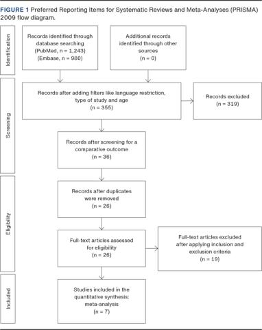The search in Embase produced 980 records. Subsequently, the following filters were applied: Randomized Controlled Trial, Adult: 19-44 years, Middle Aged: 45-64 years and Aged: 65+ years. These filers were combined with the following language restrictions: English, Danish, Swedish and Norwegian. A total of 355 records were identified. After an initial screening of the title and abstract of studies with comparative outcomes, 26 records were considered relevant. The full text of 26 records was screened for eligibility and seven records were included in this review.
