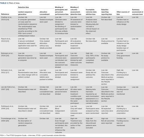 Forman-Hoffman V, Middleton JC, Feltner C et al. AHRQ comparative effectiveness reviews. Psychological and pharmacological treatments for adults with posttraumatic stress disorder: a systematic review update. Rockville (MD): Agency for Healthcare Research and Quality (US), 2018. www.ncbi.nlm.nih.gov/books/NBK525132/ (13 Mar 2020).