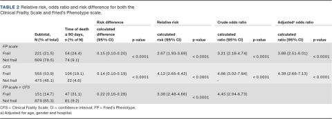 RESULTS. A total of 1,030 patients participated (mean age: 78.2 years, 54% female). Among these, 221 were frail by the FP (score > 3) and 555 participants were frail by the CFS (score > 5). Within 90 days, 128 died. The analyses revealed significant associations between frailty and 90-day mortality. For the FP, the RR was 2.67 (95% confidence interval (CI): 1.93-3.69), p < 0.001; and for the CFS, the RR was 4.12 (95% CI: 2.65-6.42), p < 0.001. The adjusted OR for the CFS was 4.38 (95% CI: 2.68-7.13); for the FP, 3.88 (95% CI: 2.51-6.01).