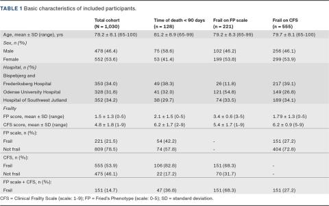 METHODS. This study comprised a prospective cohort with the following inclusion criteria: age > 65 years, acute admission and admission >24 h. Bispebjerg Hospital, Odense University Hospital and Hospital of Southwest Jutland participated in the study. The FP and the CFS were measured in all patients. Descriptive statistics, relative risk (RR), odds ratio (OR), risk difference and receiver-operating characteristics (ROC) analysis were performed. The outcome was 90-day mortality.
