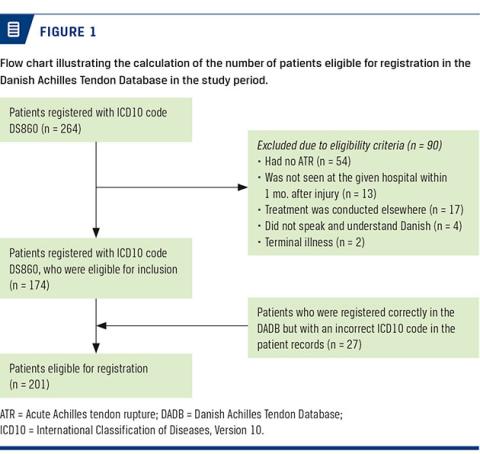 The eligibility criteria for registration in the database were: 1) diagnosed with acute Achilles tendon rupture; 2) seen at the given hospital within one month after the injury; 3) treatment provided at the given hospital; 4) ability to speak and understand Danish; and 5) no terminal illness.