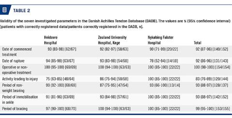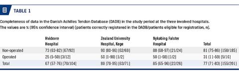 INTRODUCTION: Acute Achilles tendon rupture is a severe injury causing functional deficits and sick leave. Data from the Danish Achilles tendon Database (DADB) can help us monitor and optimise treatment. The aim of this study was to investigate the completeness and data validity in the DADB.