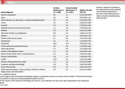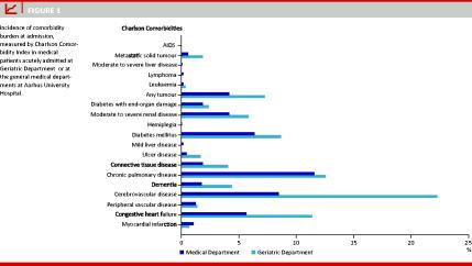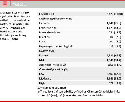 Material and methods: In an observational study, we used data from patients aged 80+ years who had been acutely admitted to departments of medicine at Aarhus University Hospital in the period from 1 January 2009 to 31 December 2010. Age, comorbidity and LOS in the Geriatric Department (GD) were compared with those of the general medical departments (MD). A subgroup analysis was made on patients admitted during a 3.5-month period.