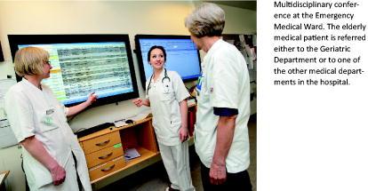 In Aarhus, acute medical patients are admitted at two different emergency medical wards (Tage Hansensgade and Nørrebrogade). CGA is performed only in the emergency ward at Tage Hansensgade and in the acute geriatric ward (GD) at the same location. Patient care, medical intervention and treatment, nutrition, training and social concerns are catered for by a multidisciplinary specialist team including medical, nursing and therapy staff. Members of the team meet with the patient and his or her relatives to discuss goals and plans for discharge one of the first days of hospitalization. Continuity of care is planned in cooperation with primary health care. The multidisciplinary team is responsible for establishing a relevant assessment and rehabilitation plan. Patients are primarily transferred to the Geriatric Department if they have major social problems, a low functional level and high comorbidity. Severe illness is not a reason for refusing admission to the Geriatric Department.
