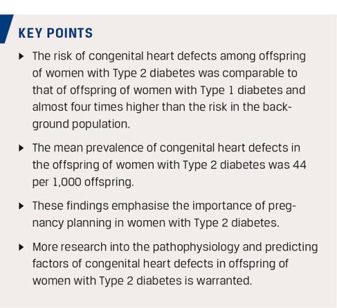 While it is well described that the risk of congenital malformations is increased by at least two-fold in offspring of women with Type 1 diabetes [2], data on offspring of women with Type 2 diabetes are scarcer. The most common congenital malformations are heart defects, both in offspring of women with diabetes and in the background population [3]. Congenital heart defects (CHD) often have significant clinical implications for the offspring and thus a major impact on the whole family. Whether the risk of CHD in offspring of women with Type 2 diabetes is comparable to the risk in offspring of women with Type 1 diabetes has only been sparsely investigated [1, 4], and reviews exploring this topic could not be identified in the literature. A strong positive correlation between glycaemic control and the prevalence of congenital malformations, specifically CHD, has been described among offspring of women with Type 1 diabetes [5]. The association between congenital malformations and hyperglycaemia is poorly understood, but hyperglycaemia may induce oxidative stress and cell-membrane damage, causing apoptosis and thereby disturbing organogenesis [5, 6]. Animal studies have indicated that the developing heart is particularly sensitive to hyperglycaemia [7, 8].
