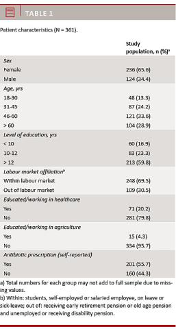 In addition, we gathered sociodemographic information (age, sex, educational level, labour market affiliation, educated/working in healthcare or agriculture) and patients were asked if they were prescribed an antibiotic (self-reported antibiotic prescription).