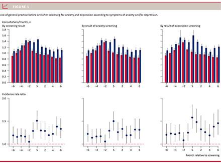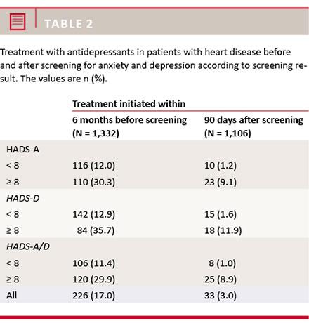 Results: Patients with heart disease and anxiety or depressive symptoms had more general practitioner (GP) contact rates than patients without anxiety or depressive symptoms both before and after the screening. Furthermore, patients with depressive symptoms increased their GP contact rate significantly in the first month after the screening, while this was not the case for patients with anxiety symptoms. Finally, patients with heart disease and anxiety or depressive symptoms more frequently initiated treatment with antidepressants than patients with heart disease without anxiety or depressive symptoms, whereas therapy sessions with a psychologist were rarely used.