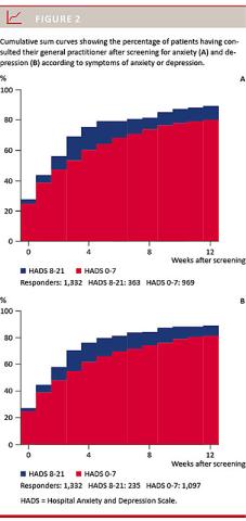 During the first four weeks after the screening, 75% of the patients with anxiety symptoms and 60% (p < 0.001) of the patients without anxiety symptoms had seen their GP, whereas 76% of the patients with depressive symptoms and 62% (p < 0.001) of the patients