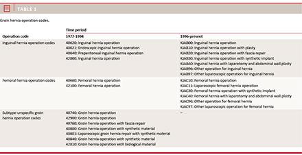 By the use of the CPR number, a register-based cohort consisting of all Danish residents who were born in Denmark in 1977 or later was established. Within this cohort, all groin hernia operations (inguinal and femoral hernias) performed in the study period (1 January 1977-31 December 2010) were identified through the Danish Classification of Surgical Operations and Therapies and the NOMESCO Classification of surgical operations. The included operation codes from 1977-2010 are presented in Table 1.