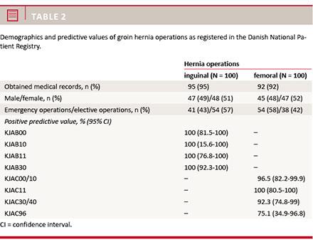 operations being misclassified. When examining the validity for groin hernia operations (inguinal hernias and femoral hernias combined), the overall PPV for groin hernia operations in the DNPR was 98.4% (95% CI: 95-99%). Regarding age, the PPV was generally higher than 97% for all age groups.