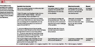The colour-marked interview bits from all the interviews were then printed on paper and sorted according to the three NOTSS elements under each category. For each element, the bits were further sorted into subgroups which were subsequently labelled. For each labelled subgroup, one to two paraphrases were written. For each paraphrase, one observable behavioural example was written. The interview bits that did not fit the existing categories were analysed separately. Data were analysed in an iterative process in the research group to ensure adequate sorting. Table 1 illustrates the process from interview quotation to behavioural example in the category of Communication and Teamwork. The other categories were analysed in a similar way.