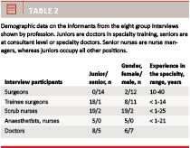A total of 72 clinicians participated in the interviews which lasted between 52 and 84 minutes. Groups consisted of: 4 and 10 consultant surgeons, 12 and 7 trainee surgeons, 14 and 7 scrub nurses and 11 and 7 from the anaesthesia team (nurses and doctors), respectively. Table 2 shows the demographic data of the participants.
