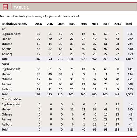 Improvements in surgical technique, anaesthesia and peri- and post-operative management (the fast-track concept) have significantly reduced morbidity and mortality [1, 4] and concurrently new treatment principles have been developed. Therefore, patients previously found unsuitable for surgery may now be offered RC. Also, during recent years a rapid increase in the use of minimally invasive surgery, mainly robot-assisted surgery, has been observed. Finally, based on an active decision from the Danish Health and Medicines Authority, the treatment of bladder cancer has now become centralised, and only five departments are authorised to perform cystectomy in Denmark, in a population of five million citizens.