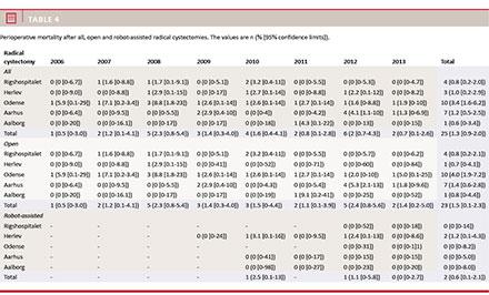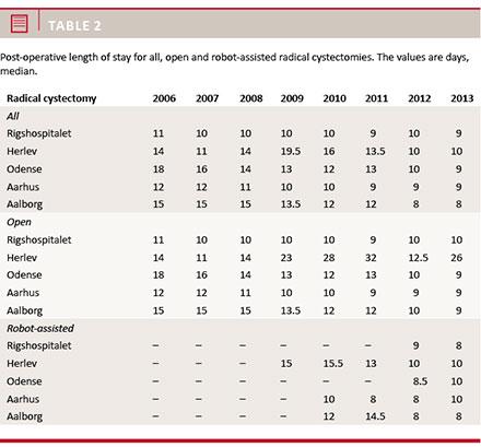 The limitations of the present study are mainly that data were obtained from the Danish National Hospital Register based on a simple anonymised database search and with a focus on year and hospital. A number of items are therefore not considered, including complications (except for mortality), reasons for readmissions, urinary diversion type and whether performed intra- or extracorporally when using robot, tumour stage and co-morbidity. Also, collecting data from central registries always implies a risk that data are incomplete. However, in the study by Johansen et al [6], an agreement of 99% was found between surgical procedure and discharge summary, and an audit at Rigshospitalet for the eight-year study period showed a 99.6% agreement between data from a local database and data from the National Patient Register (NPR). These findings are in contrast to a recent study by Jerlstrom et al [10] who presented Swedish results based on a national population-based database, which only included 66% of the relevant patients. Thus, a strength of the present data are the national data and complete data on LOS, readmissions and mortality, since almost all operations and hospitalisations are registered in the NPR.