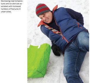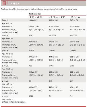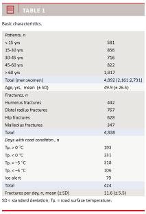 Results: A total of 4,892 patients (4,938 fractures) were treated during the study periods. The daily number of distal radius, humeral and ankle fractures increased significantly with decreasing road surface temperature and the presence of IA. For hip fractures no significant association was found. Decreasing temperature was associated with a significant decrease in the daily number of fractures for patients < 15 years, whereas patients > 30 years experienced a significant increase.
