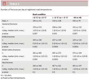 Conclusion: Decreasing road temperature results in increased numbers of all fractures except hip fractures. Low temperatures is a risk factor for patients > 30 years and a protective factor for patients < 15 years.