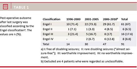 In all, 67% of all patients in the study were classified as Engel I indicating no disabling seizures at the latest follow-up, including seven re-operated children (Table 1). For 24% of the patients, the post-operative outcome was classified as Engel II or III indicating rare disabling seizures or a worthwhile improvement, whereas less than 10% had Engel IV, i.e. no worthwhile improvement. Fewer children were classified as Engel I in the last time period (2006-2010) than in the two previous periods.