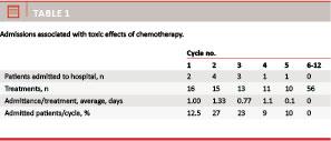 The SAEs recorded were diarrhoea (n = 4), febrile neutropenia (n = 3), and nausea and vomiting (n = 4) distributed on 11 patients. No patients were admitted or had prolonged admittances due to toxicity after having received more than five cycles. The number of extra hospital admittances and the length of admittances distributed according to cycle number are shown in Table 1. At follow-up, a total of 121 series were administered, resulting in 11 admissions of an average duration of 5.4 days (range, 1-12 days), resulting in 0.49 days of admissions per treatment due to toxicity.